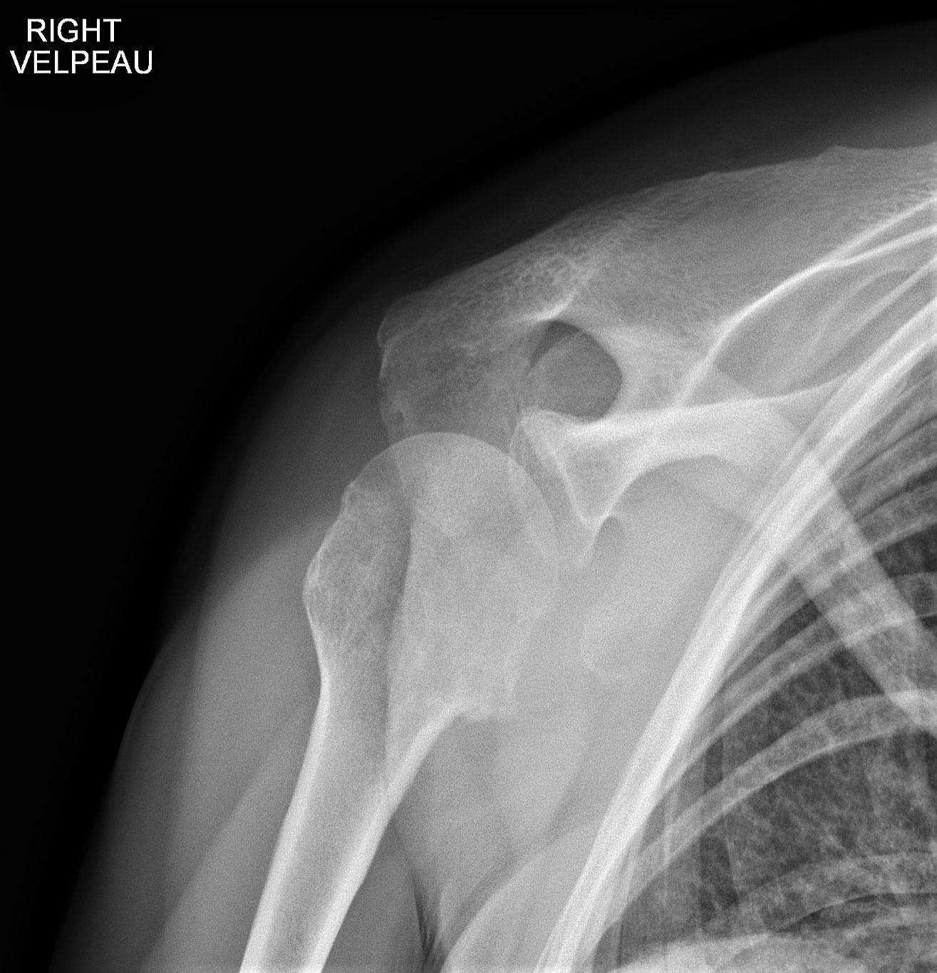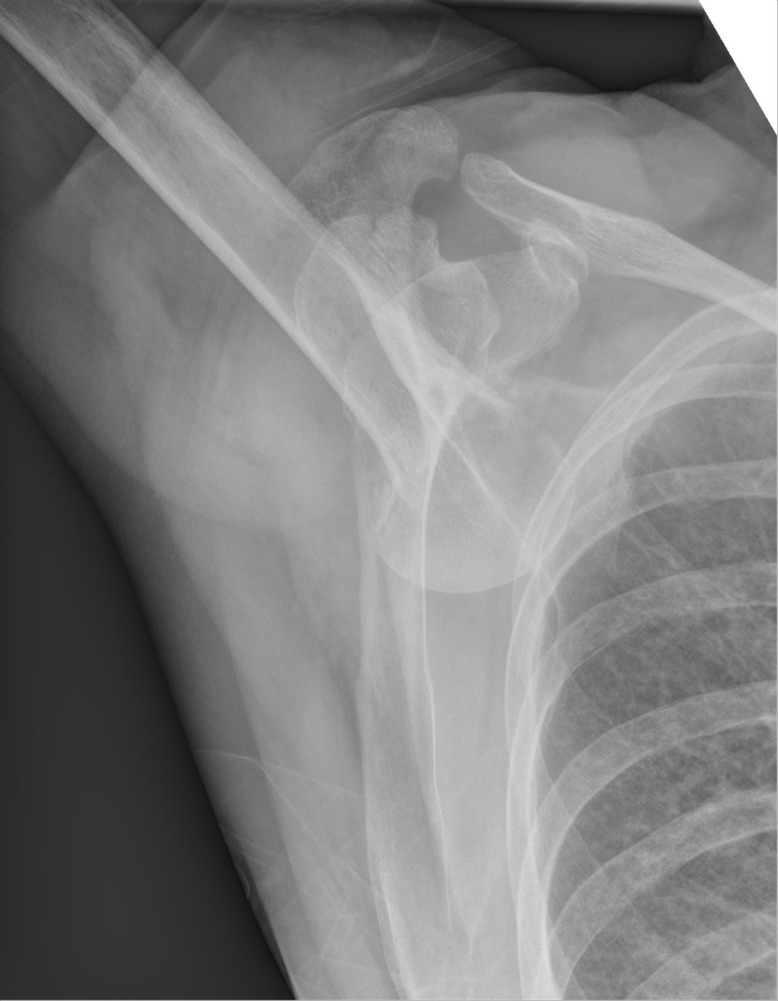 - disparition de l’interligne articulaire (trop bel aspect sphérique de la tête humérale)
